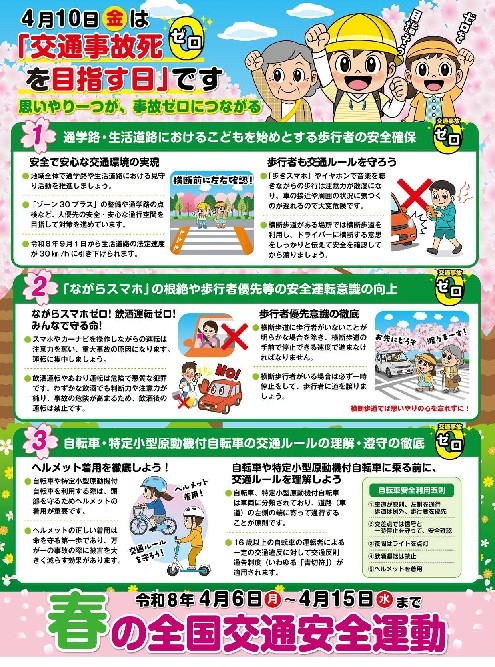 2026/04/07令和8年度 春の全国交通安全運動が始まりました🌸 春の全国交通安全運動が本日より始まりました。 新しい生活が始まる季節、道路には慣れない環境で行動する子どもや高齢の方も多くなります。 当社では、地域の皆さまの安全を守るため、社員一人ひとりが交通ルールの遵守と安全運転の徹底に取り組んでまいります。 また、4月10日は、「交通事故死 ゼロ を目指す日」です。かけがえのない命を守れるよう、そして地域の安心につながる行動を心がけてまいります ≪ 新年あけましておめでとうございます トップページに戻る 最近の投稿 2026/04/07 令和8年度 春の全国交通安全運動が始まりました🌸 2026/01/15 新年あけましておめでとうございます 2025/09/11 社員旅行 月岡温泉♨ 2025/09/01 フォークリフト安全講習会を実施 2025/09/01 令和7年度 順調にスタート!! カテゴリー お知らせ(33) 月別アーカイブ一覧 2026/04 2026/01 2025/09 2025/03 2024/11 2024/04 2024/01 2023/09 2023/07 2023/04 2022/11 2022/09